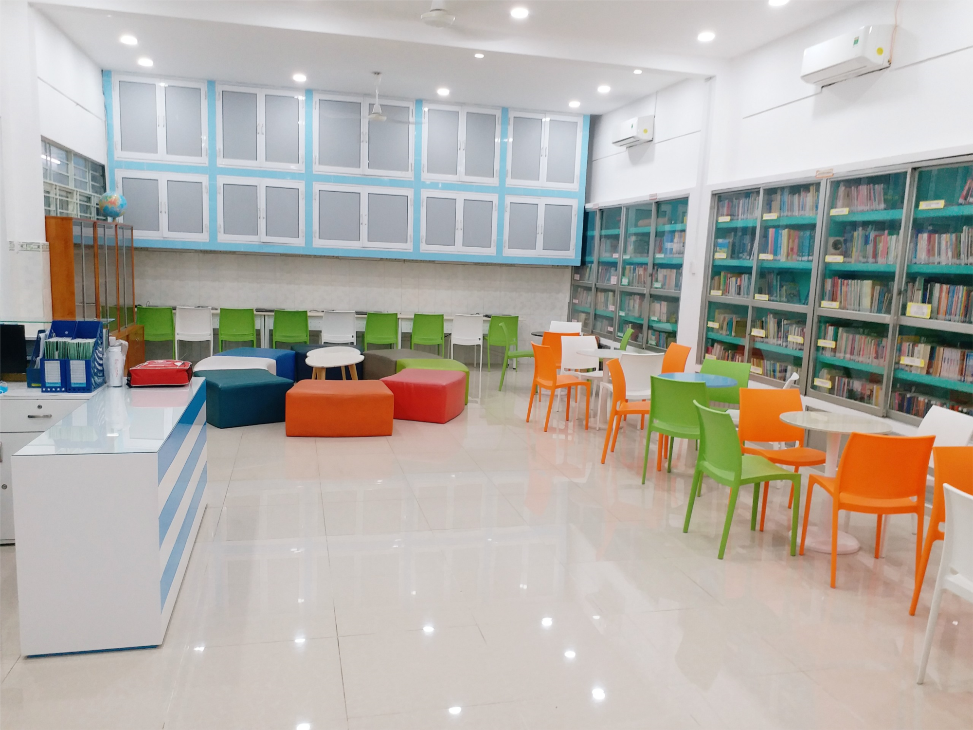 Phòng Thư viện được trang bị máy lạnh, áng sáng đầy đủ với bàn ghế mới nhiều sắc màu thu hút được mọi ánh nhìn, học sinh rất thích thú khi được ngồi trên sa-lon mềm mại, máy vi tính (lap top) có kết nối mạng phục vụ cho học sinh và giáo viên, kho sách sắp xếp gọn gàng theo bảng phân loại theo đúng quy định và là nơi trao đổi kiến thức về sách, báo của trường.. Đây là một không gian rộng thoáng, sáng và yên tĩnh, mang lại hiệu quả tối ưu cho việc đọc sách.